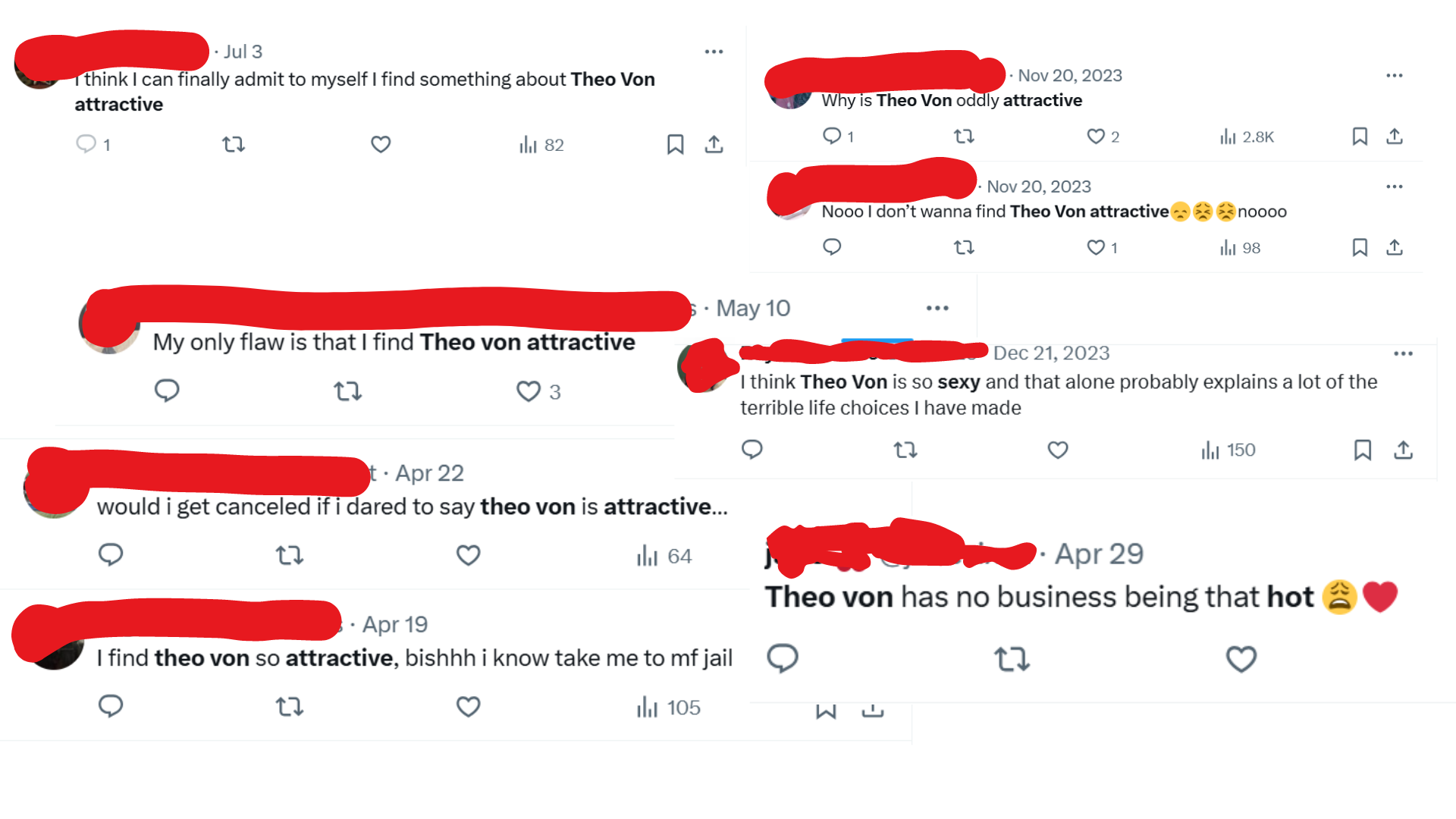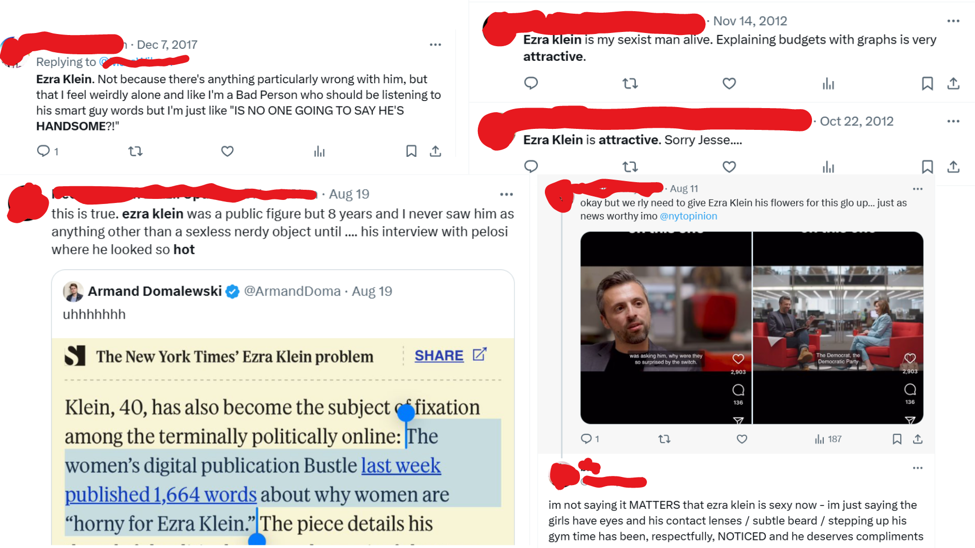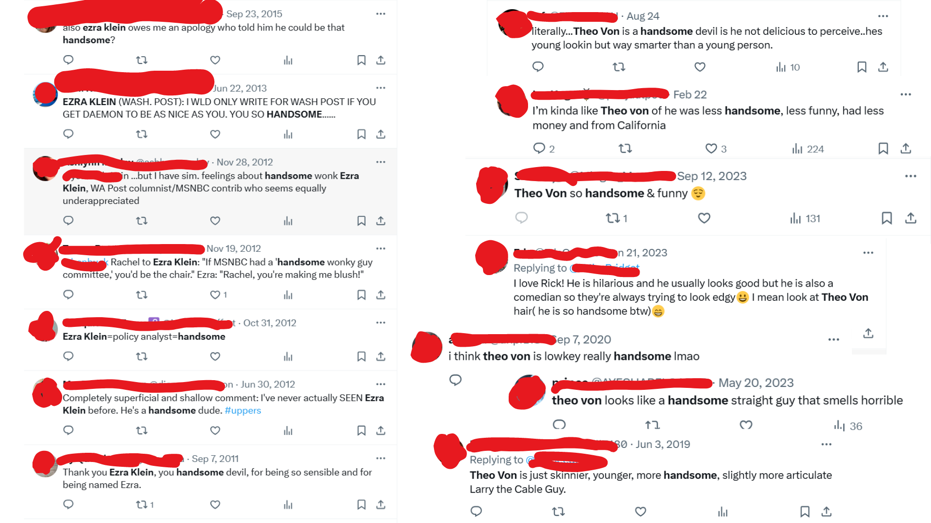 The results were genuinely surprising — there were like three people over the past decade who’d tweeted about finding Ezra Klein “attractive,” but many more who’d done the same re: Theo Von, often adding that they were embarrassed by their being attracted to him.