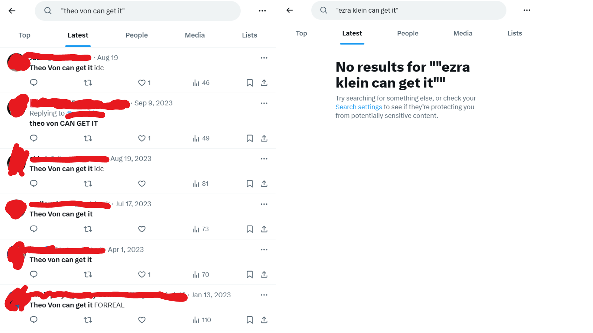 Additionally, we cannot discount the possibility that my results were skewed by the post-Elon Twitter landscape, because it’s safe to assume that Elon Musk personally probably likes Theo Von way more than he likes Ezra Klein, and as a result might be boosting Von-related chatter, while inadvertently burying historical Klein thirst on the platform as part of a larger attempt to make Klein seem less popular than he actually is.